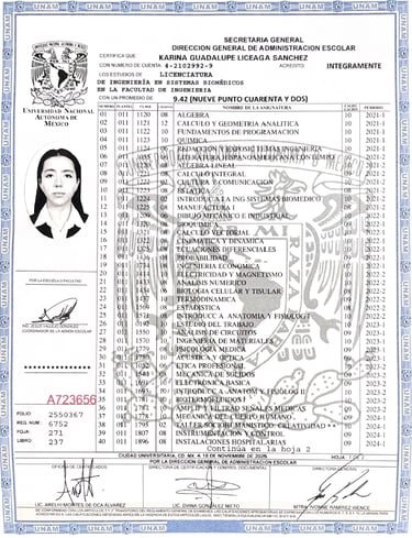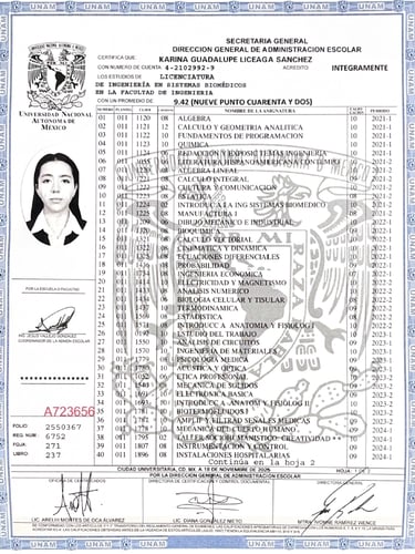 Bachelors of Science in Biomedical Systems Engineering Universidad Nacional Autónoma de México | 2021 - 2025 *Thesis: "Power Bi Visualization of Response and Mortality Rates of ESMaestras from SAS programming" The study addressed the challenges of data overload in the public health system by leveraging SAS programming for data cleaning and developing an interactive PowerBI dashboard. The project focused on visualizing the response and mortality rates within the ESMaestras cohort, a group of active and retired Mexican teachers. *Grade 9.42/10